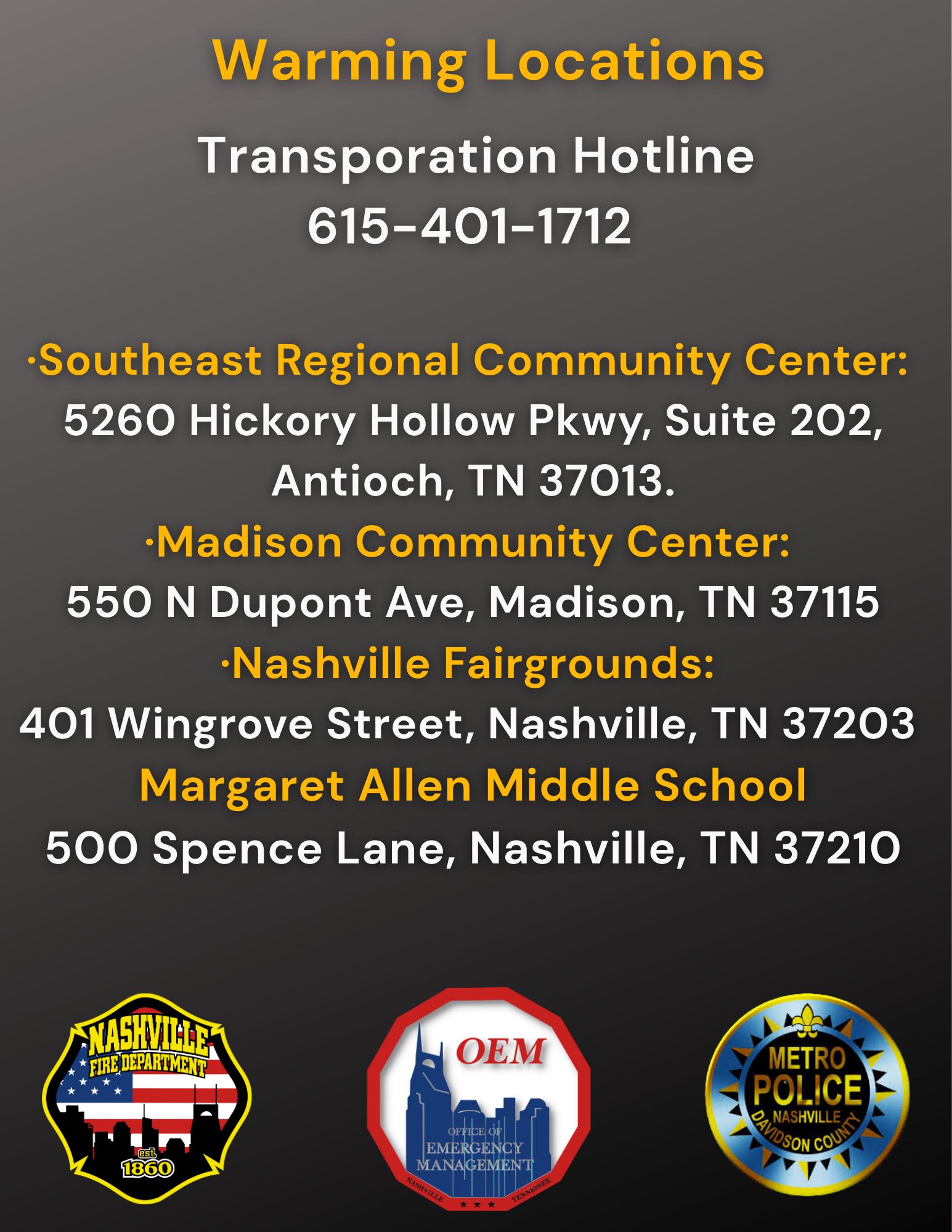 All fire stations (see here for a map), most MNPD Precincts (although not East), and several Parks Dept. community centers are operating as warming locations. There have been some new locations added, so please see graphic below for details and the number to call for Metro-arranged transportation to a warming center: